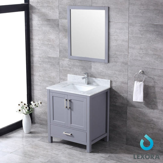 Lexora Jacques 30" Dark Grey Single Vanity Set | White Carrara Marble Top | White Ceramic Square Undermount Sink | 28" Mirror