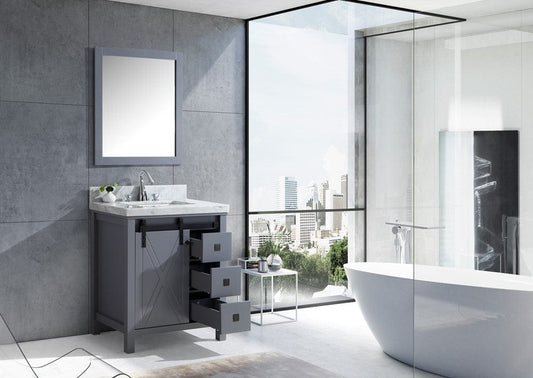 Lexora Marsyas 30" Ash Grey Single Vanity Set | White Carrara Marble Top | White Ceramic Square Undermount Sink | 28" Mirror