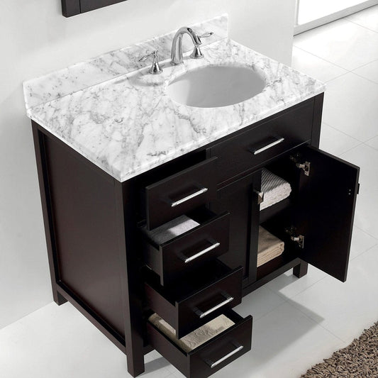 Virtu USA Caroline Parkway 36 Single Bathroom Vanity Set in Espresso w/ Italian Carrara White Marble Counter-Top | Round Basin - Leftside Drawer