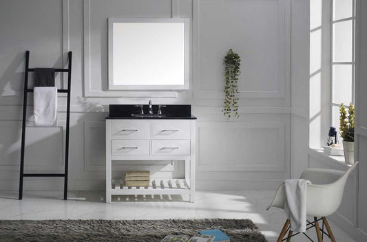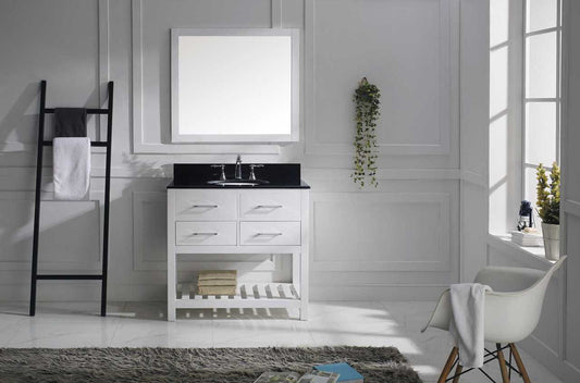 Virtu USA Caroline Estate 36 Single Bathroom Vanity Set in White w/ Black Galaxy Granite Counter-Top | Square Basin