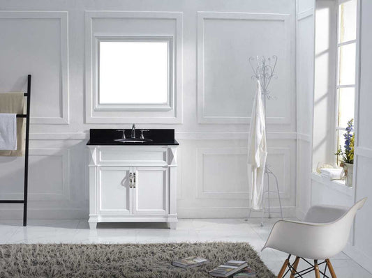 Virtu USA Victoria 36 Single Bathroom Vanity Set in White w/ Black Galaxy Granite Counter-Top | Square Basin