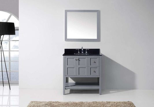 Virtu USA Caroline Estate 36 Single Bathroom Vanity Set in Grey w/ Black Galaxy Granite Counter-Top | Square Basin