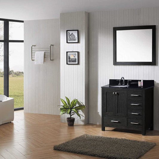 Virtu USA Caroline Premium 36 Single Bathroom Vanity Set in Zebra Grey w/ Black Galaxy Granite CounterTop | Round Basin , Rightside Drawer