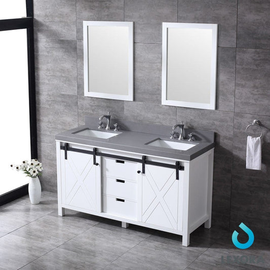 Lexora Marsyas 60" White Double Vanity Set in White | Grey Quartz Top | White Ceramic Square Undermount Sinks | 24" Mirrors