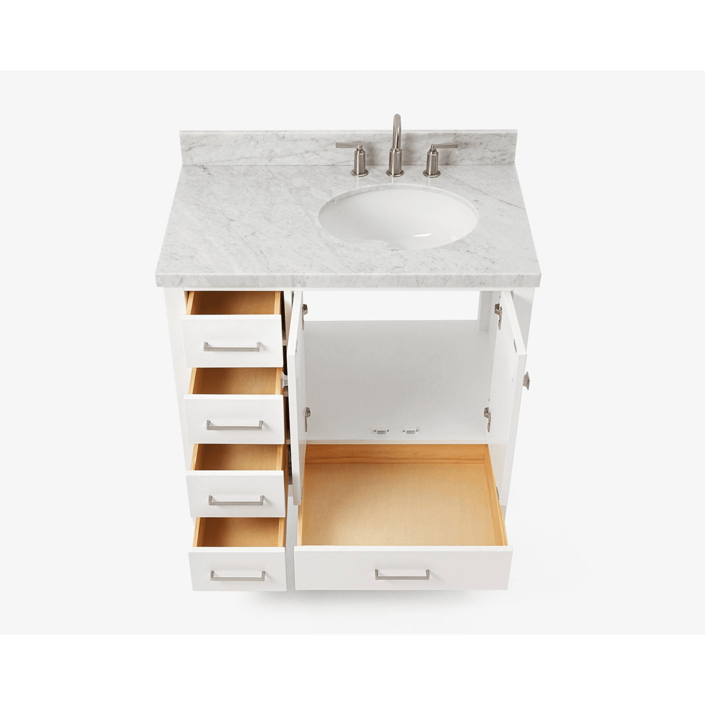 The Cambridge series from ARIEL Bath is the perfect choice for those looking for a modern bathroom vanity. The Cambridge is available in single or double sink models with ceramic under-mount sinks included. These elegantly constructed units are topped with Carrara white marble countertops and equipped with satin nickel finish hardware.