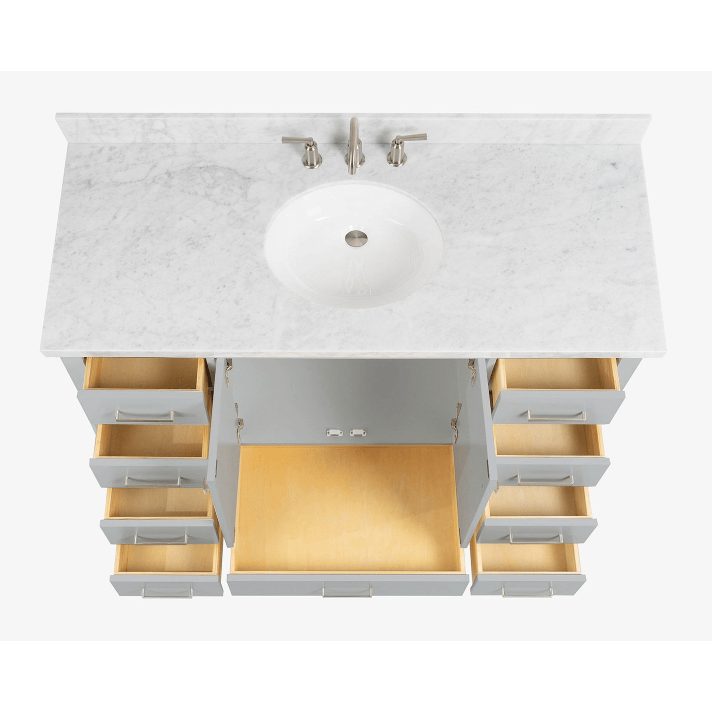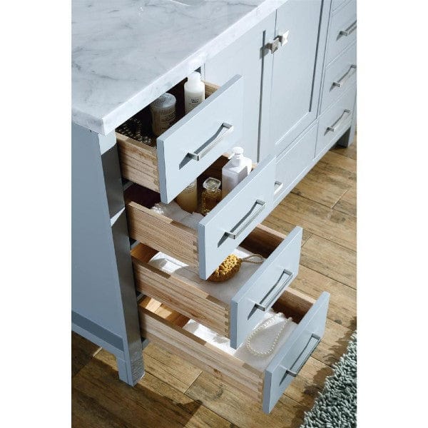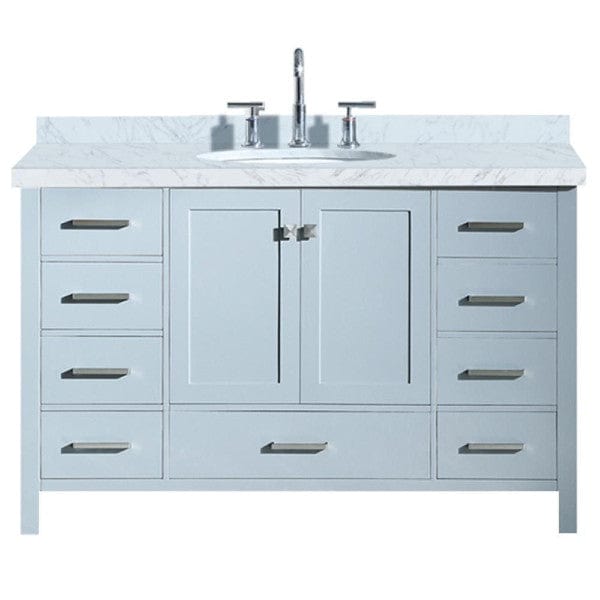 The Cambridge series from ARIEL Bath is the perfect choice for those looking for a modern bathroom vanity. The Cambridge is available in single or double sink models with ceramic under-mount sinks included. These elegantly constructed units are topped with Carrara white marble countertops and equipped with satin nickel finish hardware.