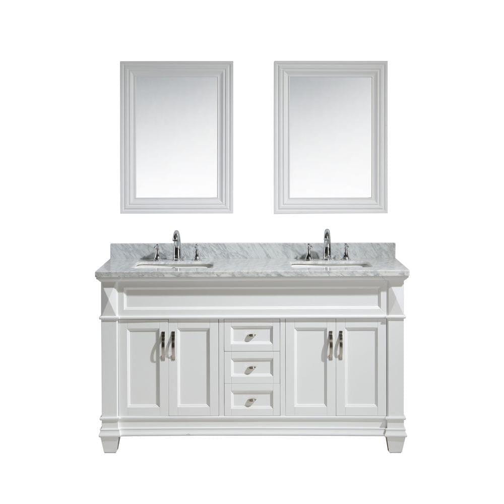 Hudson 61" Solid oak wood cabinet in white finish, white marble countertop, matching framed mirror in white