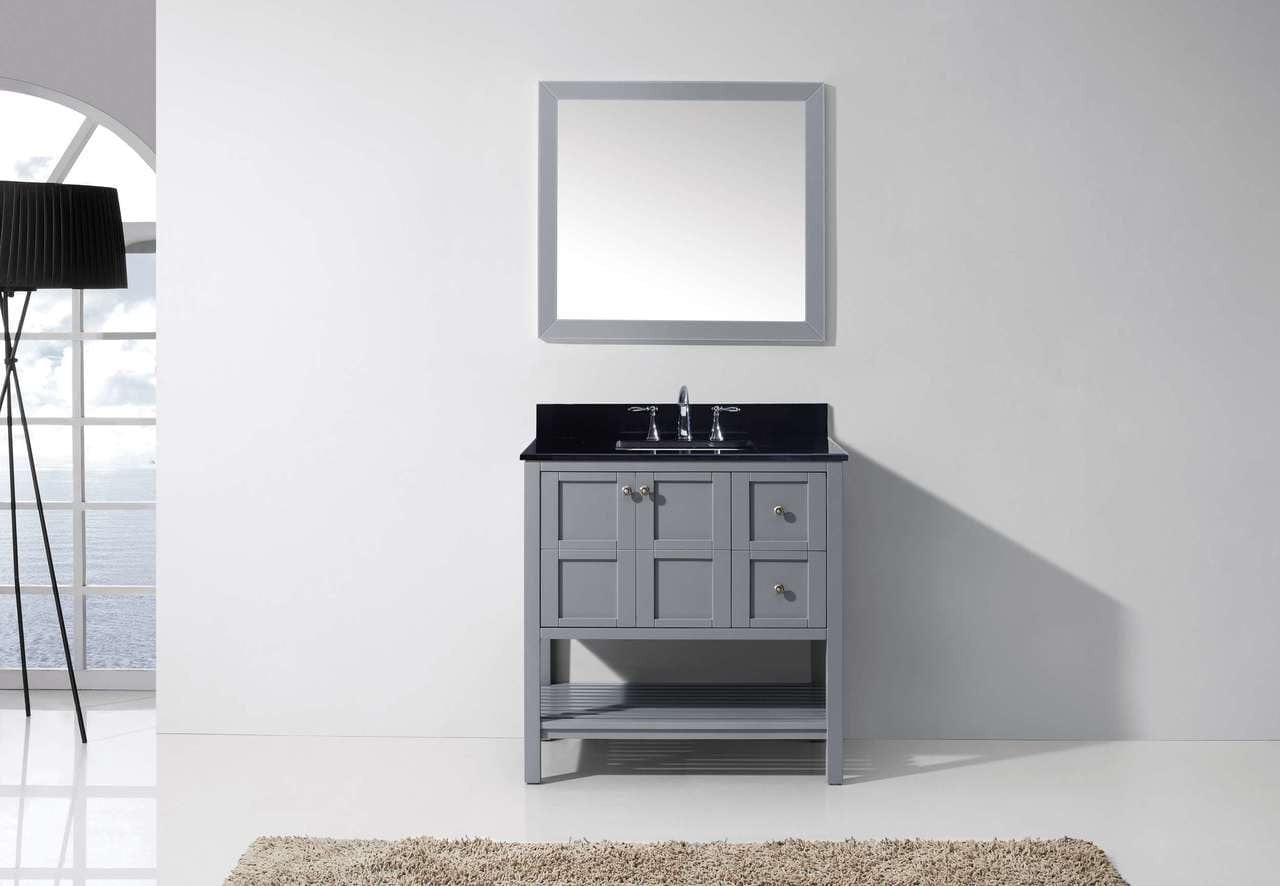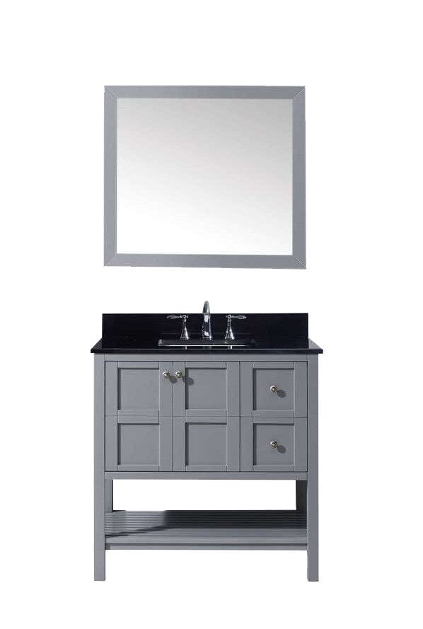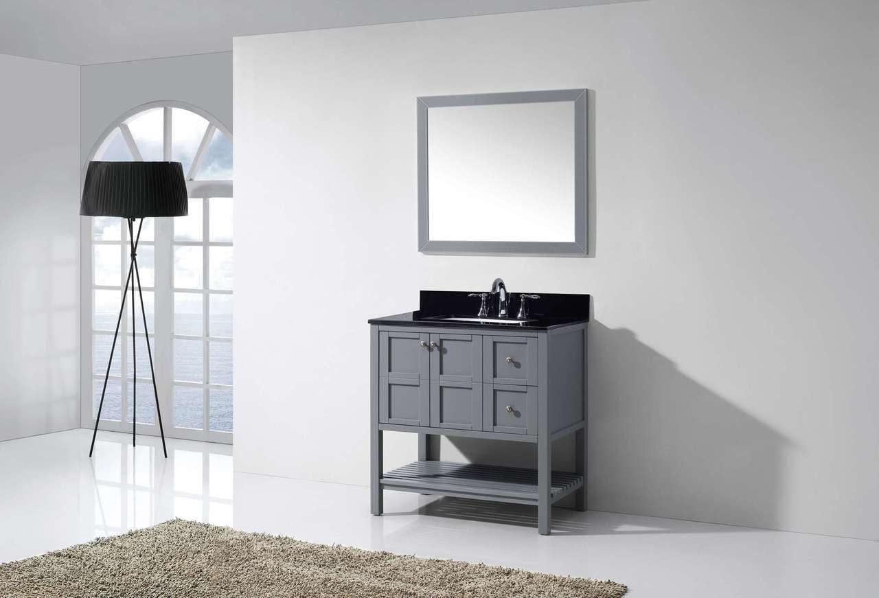 Details of the Virtu USA Winterfell 36" Single Bathroom Vanity Set in Grey w/ Black Galaxy Granite Counter-Top | Square Basin