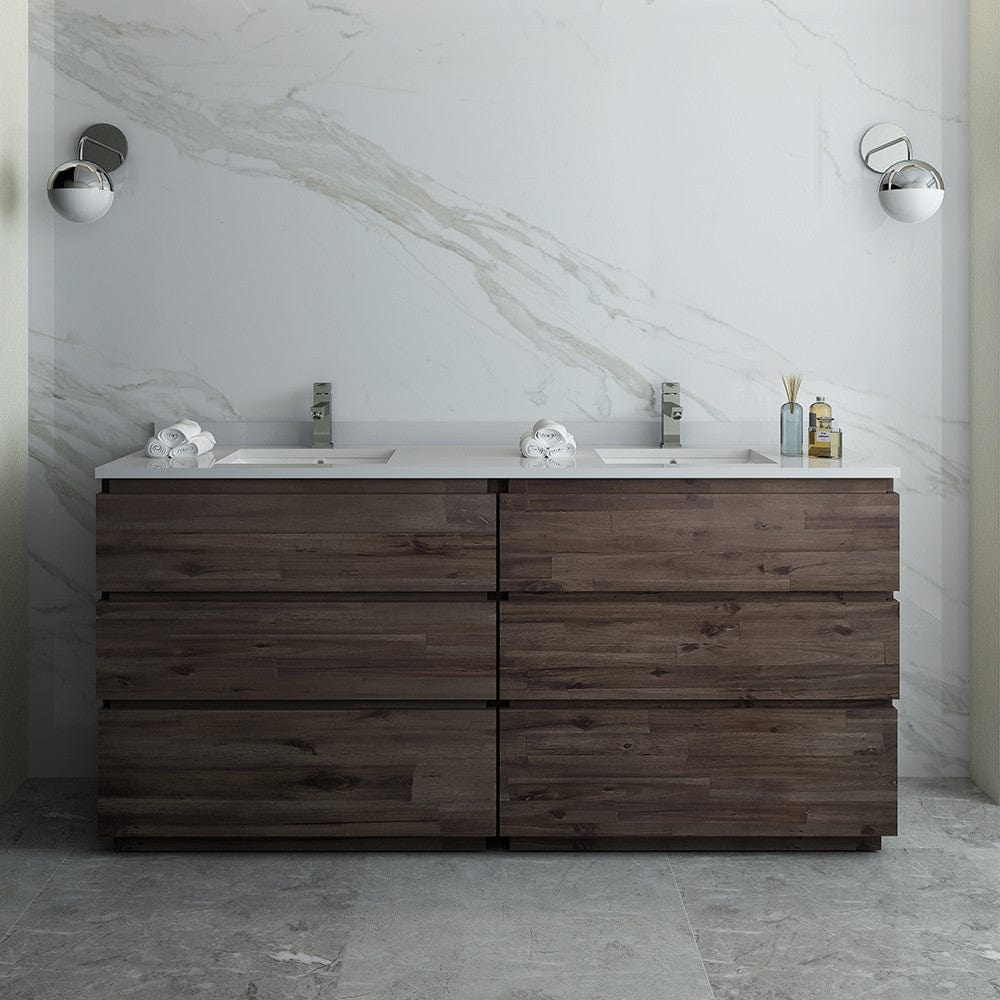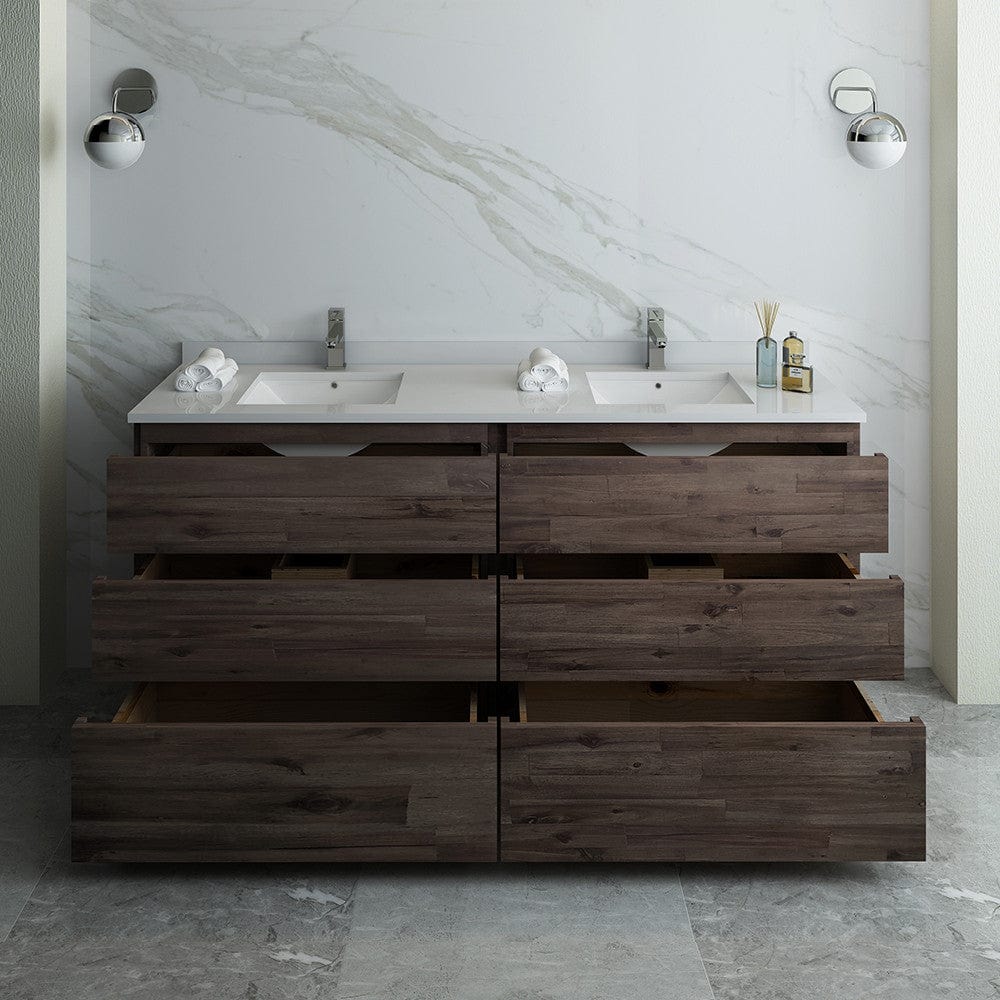 Details of the Fresca Formosa Acacia 70" Floor Standing Double Sink Modern Bathroom Cabinet | FCB31-3636ACA-FC