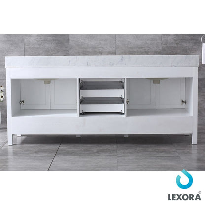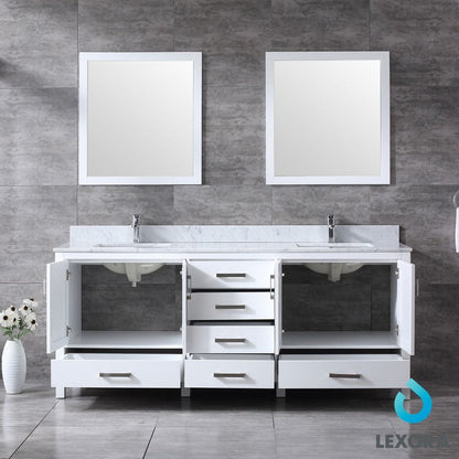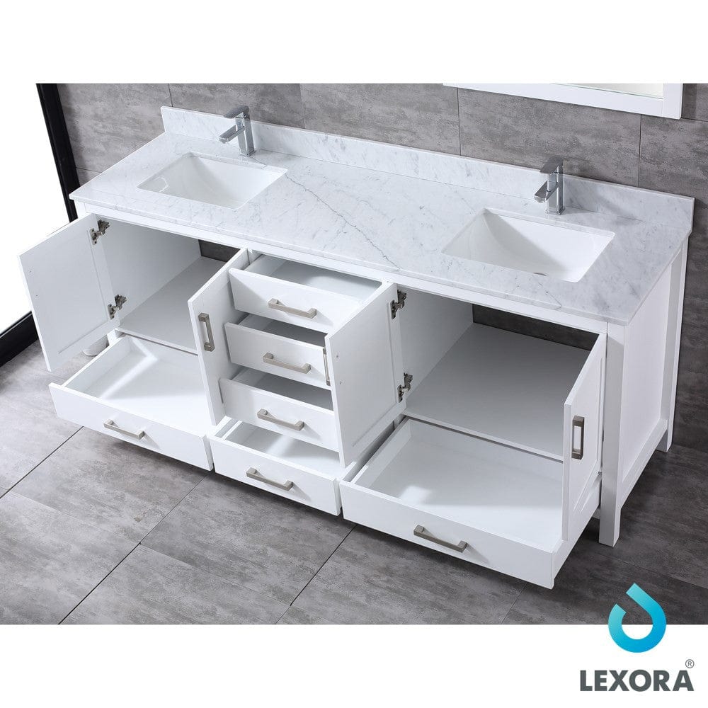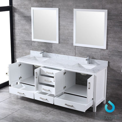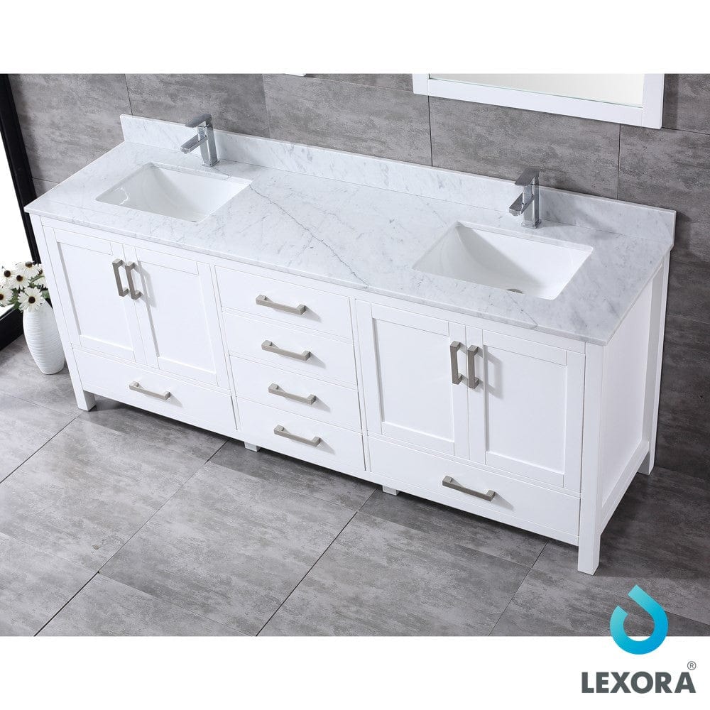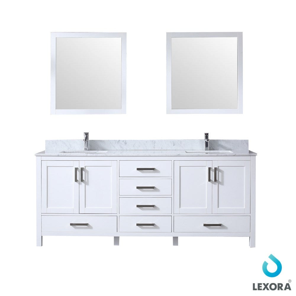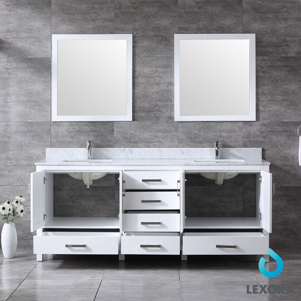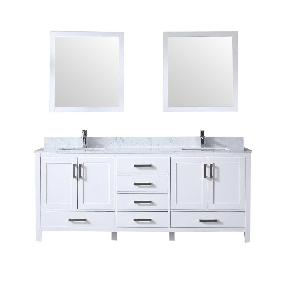 Details of Lexora Jacques 80" White Double Vanity Set | White Carrara Marble Top | White Ceramic Square Undermount Sinks | 30" Mirrors