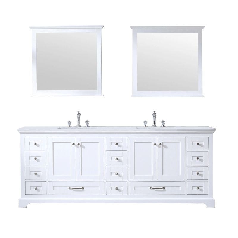 Dukes 84 Inch White Double Vanity, White Quartz Top, White Square Sinks and 34 Inch Mirror w/ Faucet by Lexora