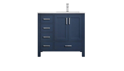 Jacques 36" Navy Blue Single Vanity, White Quartz Top, White Square Sink and no Mirror - Right Version by Lexora