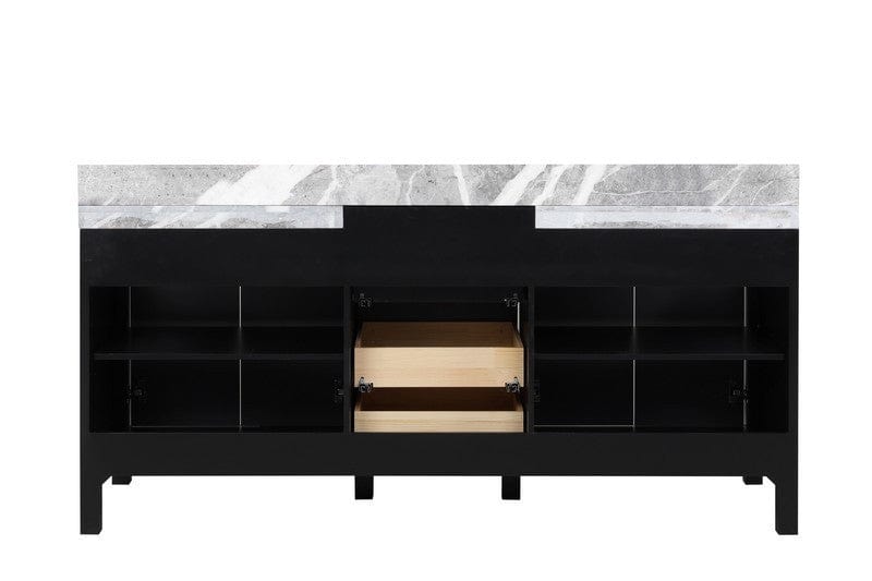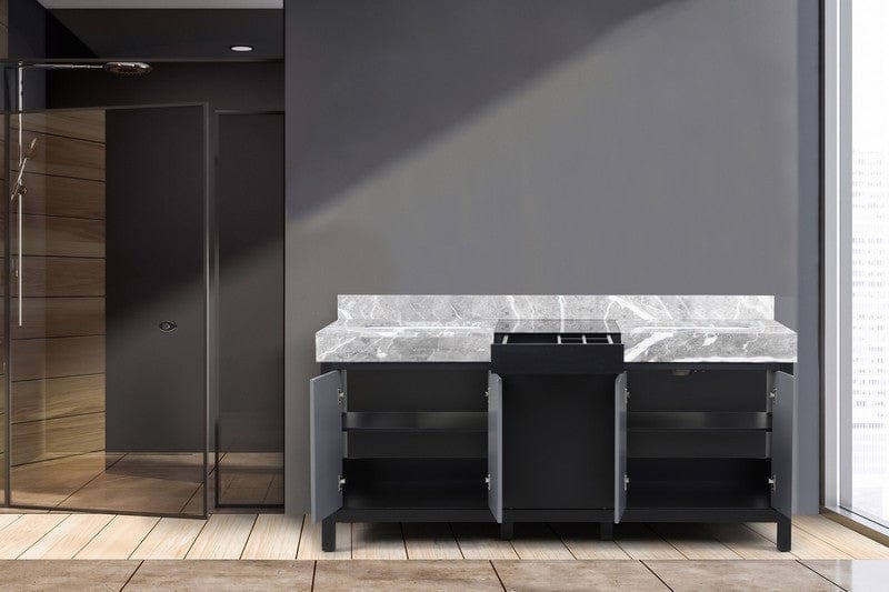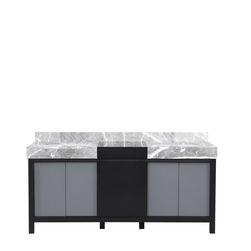 Details of Lexora Zilara 72" Black and Grey Double Vanity, Castle Grey Marble Tops, and White Square Sinks