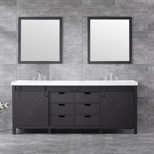 Lexora Marsyas 84" Brown Double Vanity Set | White Quartz Top | White Ceramic Square Undermount Sinks | 34" Mirrors